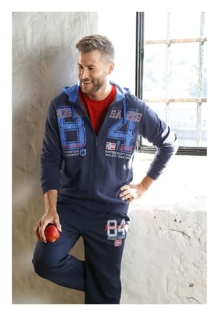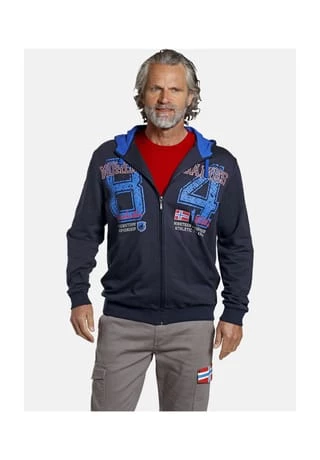 JAN VANDERSTORM ist Ihr Experte für Herrenmode in großen Größen. Sportiv und lässig: Sweatjacke GOSWIN mit Kapuzenfutter und Kordel in Kontrast. Der große Brustprint steht dabei im Mittelpunkt. Der lässige Style ermöglicht vielfältige Kombinationen. Jogginghose, Bermuda oder einfach zu Ihrem Lieblingsfreizeit-Outfit mit Jeans und Sneakers tragen. 100% Baumwolle. Maschinenwäsche.