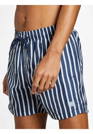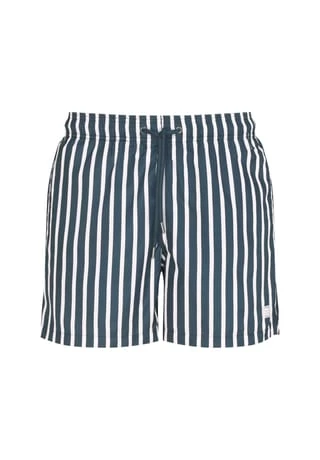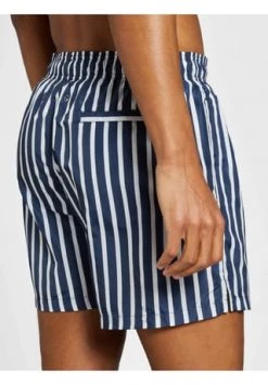 – oberschenkellange Badeshorts – chlor- und meerwasserresistentes Material – sportives Längsstreifen-Design – Stretchbund mit Tunnelzug – eingenähte Innenhose – seitliche Eingrifftaschen – Gesäßtasche mit Reißverschluss